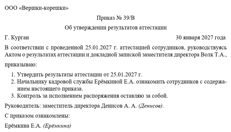 - утвердить результаты аттестации, проведенной на предприятии такого-то числа;