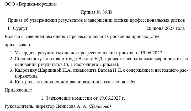 Скачать в КонсультантПлюсБесплатный доступ к документуОбразец приказа об утверждении результатов и завершении оценки профессиональных рисков