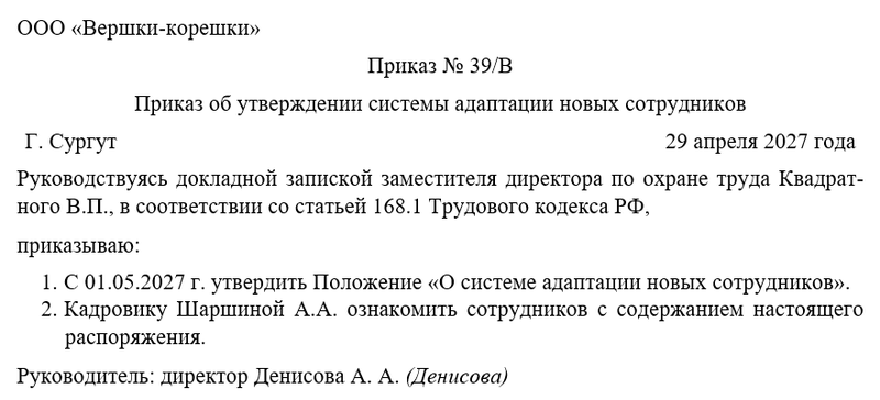 Бланк приказа об утверждении системы адаптации новых сотрудников