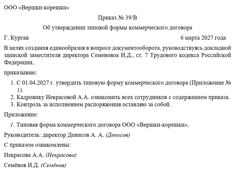Приказ об утверждении типовой формы коммерческого договора – это распорядительный документ, в соответствии с которым руководитель предприятия принимает решение о необходимости создания унифицированной формы соглашения с контрагентами. Сегодня мы разберемся, о каких конкретно коммерческих соглашениях может идти речь, зачем нужна типовая форма, причем здесь приказ директора и как правильно его оформить.