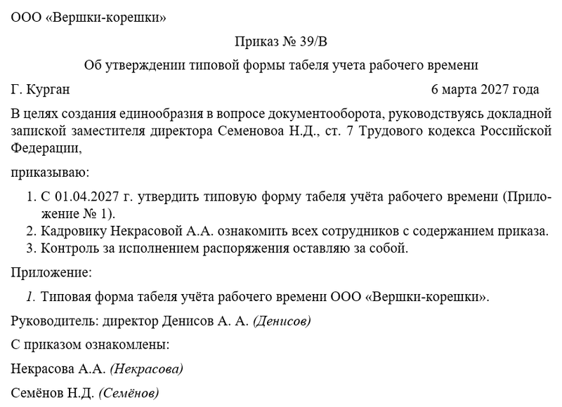- с такого-то числа утвердить на предприятии типовую форму табеля учета рабочего времени (Приложение № 1);