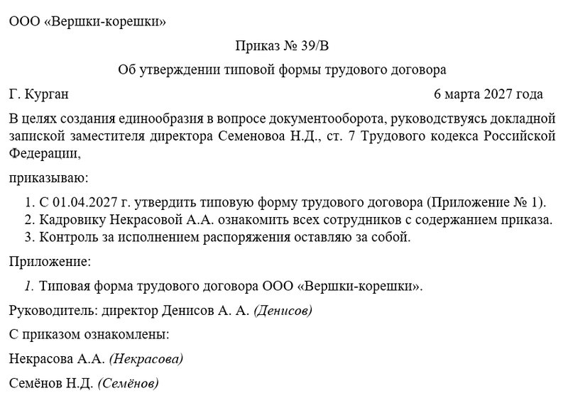 - с такого-то числа утвердить на предприятии типовую форму трудового договора (Приложение № 1);