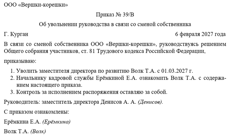 Бланк приказа об увольнении руководства в связи со сменой собственника