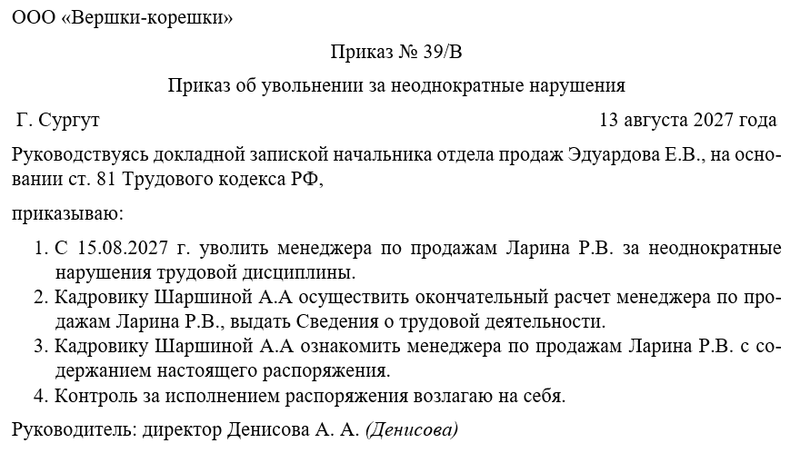 В распорядительной части указывается дата увольнения, структурное подразделение, должность и фамилия сотрудника. Приводятся ссылки на акты о дисциплинарных взысканиях и инциденты, ставшие основанием для увольнения. Подписанный приказ доводится до сведения работника под роспись. Он регистрируется в журнале приказов и хранится в личном деле сотрудника. Правильное оформление приказа исключает риск признания увольнения незаконным.