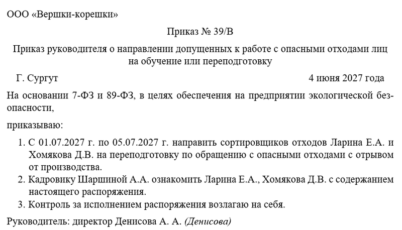 Следующим шагом директор объявляет о направлении сотрудников компании, имеющих допуск к работе с вредными и опасными отходами, на обучение либо переподготовку. Также необходимо решить вопрос о том, кто их работников будет следить за исполнением распоряжения. Не забудем назначить одного из сотрудников ответственным за ознакомлением с новым регламентом всех коллег. Это может быть руководитель отдела или целого направления, заместитель директора. Чаще всего контроль за исполнением распоряжения директор оставляет за собой.