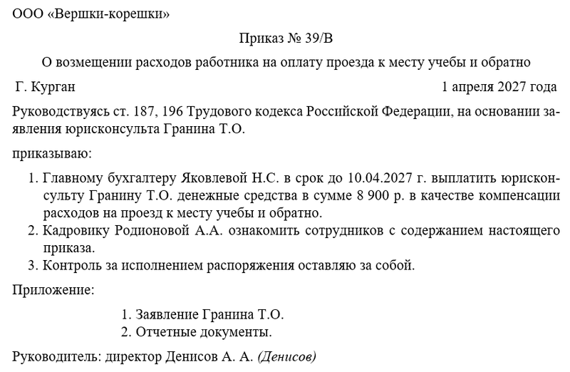 Следующим шагом руководитель объявляет возмещении расходов работника на оплату проезда к месту учебы и обратно, возлагает ответственность за исполнение приказа, а также назначает человека, который будет осуществлять контроль. Чаще всего контроль за исполнением распоряжения директор оставляет за собой.